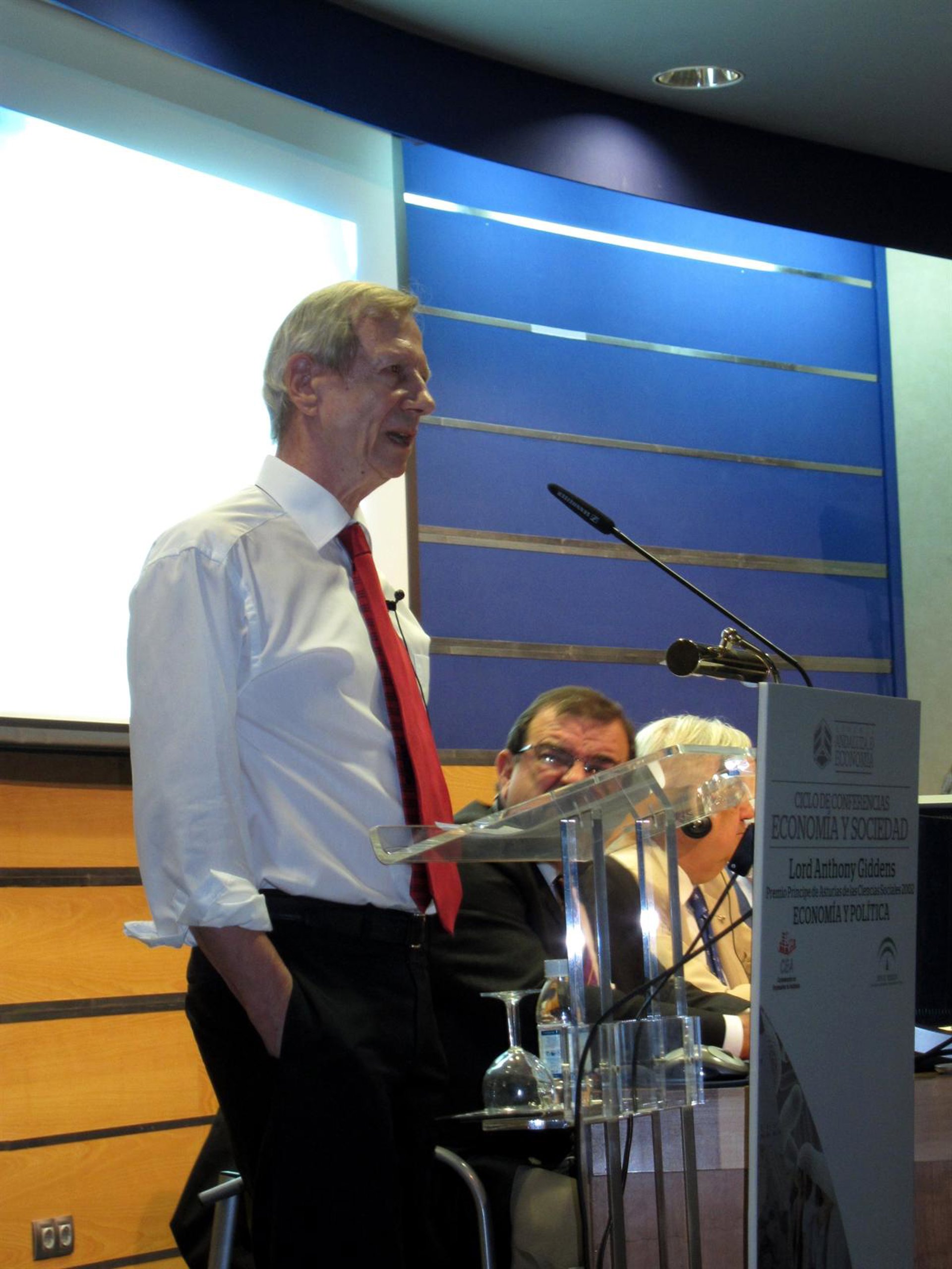 Giddens ha participado en el ciclo de conferencias 'Economía y sociedad', organizado por la Escuela Andaluza de Economía, con una conferencia sobre '¿Qué futuro para Europa?', donde se ha mostrado "europeísta convencido" y donde considera que la UE "está en mejores condiciones que otras zonas para emprender reformas y mejorar la gobernanza económica" frente a situaciones como la crisis actual.