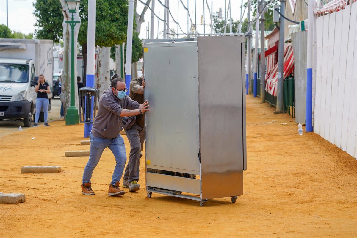 Trabajadores preparando y adecentando las casetas del recinto ferial a tres días para la inauguración de la Feria de Abril de Sevilla 2022 después de dos años sin celebrarse por la pandemia a 27 de abril del 2022 en Sevilla (Andalucía, España) - Eduardo Briones - Europa Press