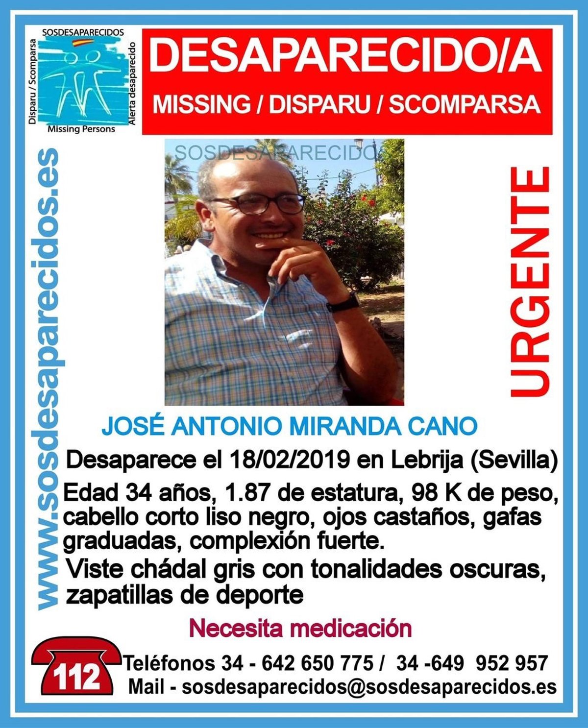 Agentes de la Guardia Civil buscan desde la mañana de este lunes a José Antonio M.C., un varón de 34 años de edad, desaparecido en el municipio sevillano de Lebrija, después de la denuncia interpuesta por la familia de este hombre.