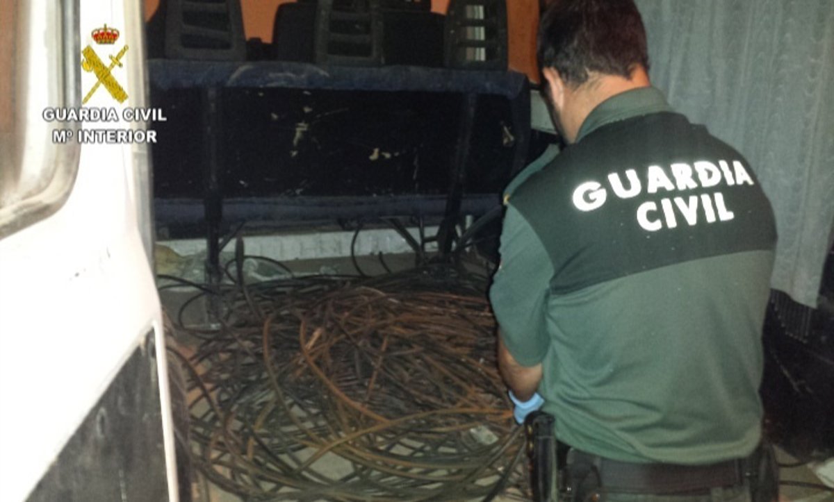 La Guardia Civil inspeccionó la furgoneta y encontró en el interior cable de cobre enrollado y cortado en ambos extremos, un hacha de grandes dimensiones, un juego de herramientas Tocler, una palanca metálica y unos alicates finos de agarre.
