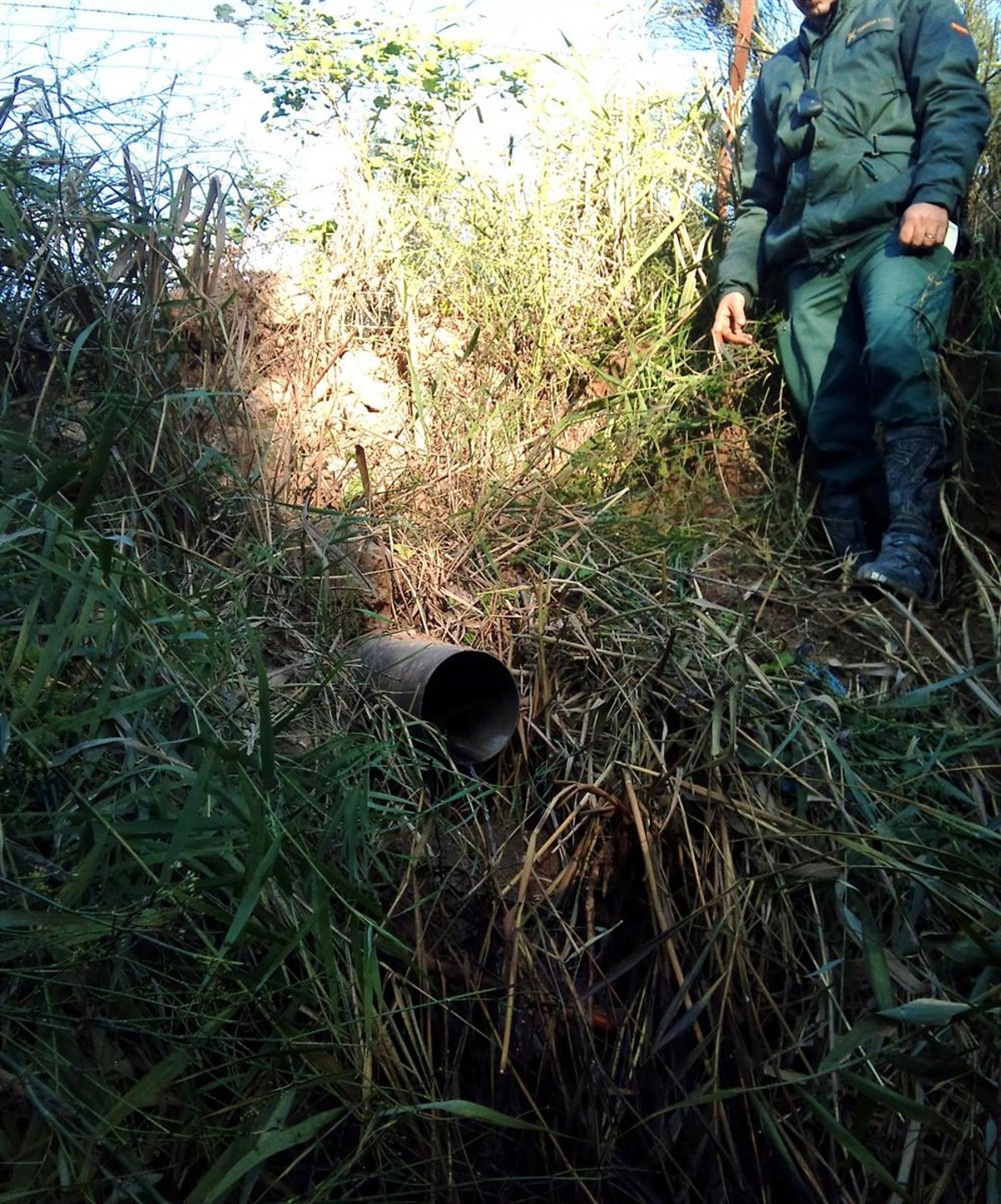 Los componentes del Servicio de Protección de la Naturaleza, tras realizar indagaciones para localizar el vertido, inspeccionaron la cuenca y localizaron una tubería de pvc, de 800 metros de largo, bajo tierra y oculta entre la hierba.