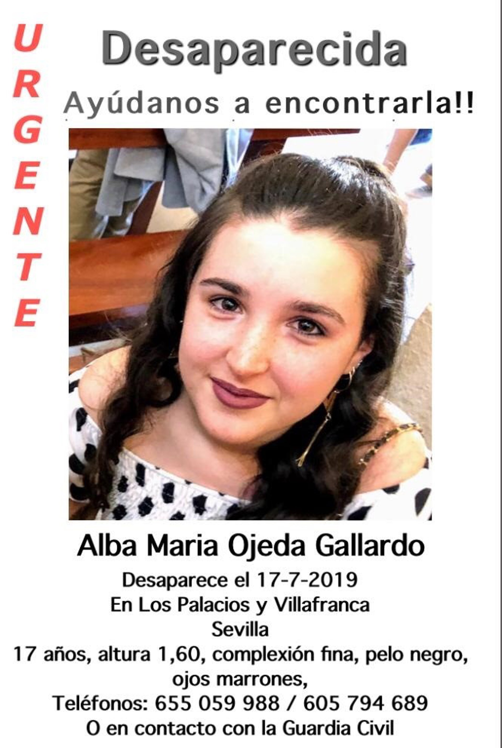 La Policía Nacional ha encontrado en la ciudad de Sevilla, y en buen estado, a Alba María Ojeda Gallardo, una joven menor de 17 años de edad y vecina del municipio sevillano de Los Palacios y Villafranca, que desapareció en la mañana de este pasado miércoles cuando se desplazó a la capital hispalense.