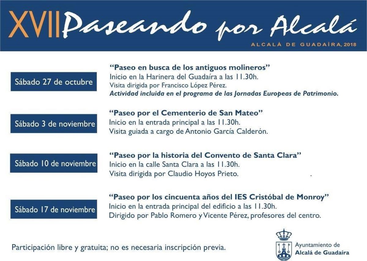 El Ayuntamiento de Alcalá de Guadaíra (Sevilla) inicia este sábado la XVII edición del programa de visitas guiadas gratuitas para la difusión de su patrimonio local, 'Paseando por Alcalá', que este año tocará desde la vida de los antiguos molineros, a la historia del convento de Santa Clara, el cementerio de San Mateo o el IES Cristóbal de Monroy en su 50 aniversario.