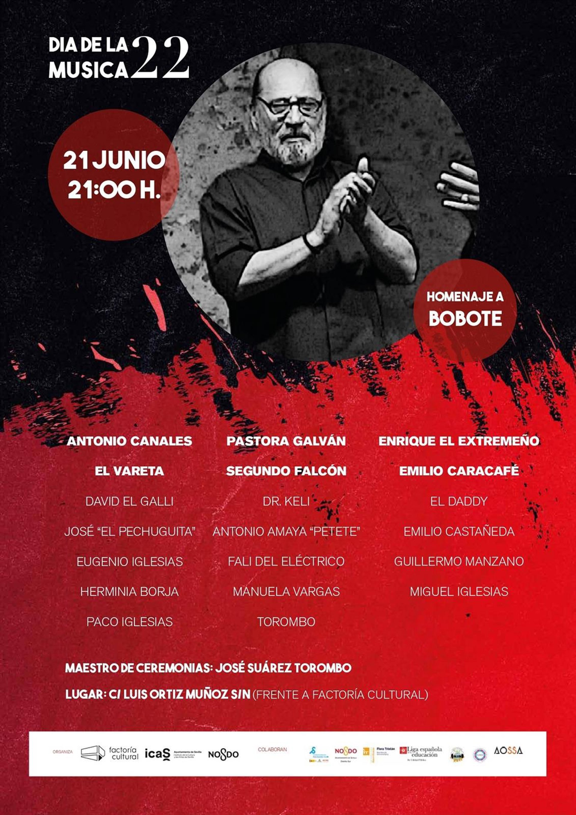 Factoría Cultural, equipamiento dependiente del Instituto de la Cultura y las Artes (ICAS) del Ayuntamiento de Sevilla, celebra el próximo martes 21 el Día Europeo de la Música con un espectáculo en el que se le rendirá homenaje al José Jiménez 'Bobote', "imprescindible" en la historia del flamenco actual. Más de una veintena de figuras destacadas de este arte, como Antonio Canales, Pastora Galván, Enrique 'El Extremeño' o como Emilio Caracafé, El Vareta o El Torombo, entre otros, ensalzarán la figura de este reconocido palmero y bailaor sevillano con un concierto gratuito en Luis Ortiz Muñoz.