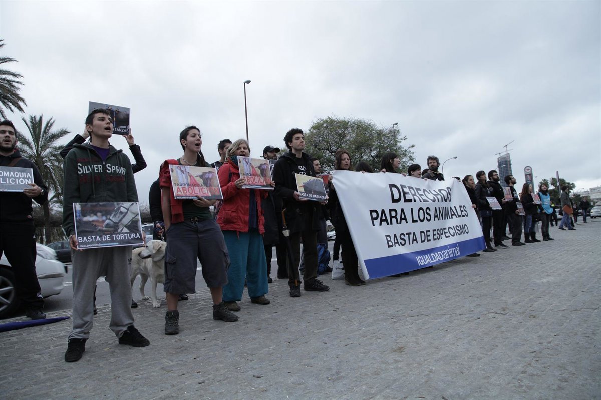 Alrededor de 50 personas, según Igualdad Animal, se han concentrado este domingo ante la plaza de toros de la Real Maestranza de Caballería de Sevilla, coincidiendo con la corrida con la que se inicia la temporada taurina de la capital hispalense, para exigir la abolición de la tauromaquia y reclamar "respeto" para los astados.