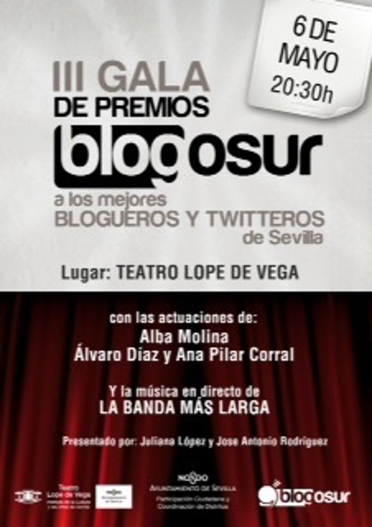 El Teatro Lope de Vega alberga este lunes el acto de entrega de los III Premios Blogosur, promovidos por 'Grupo Blogosur Comunicación S.L.' de la mano del Ayuntamiento de Sevilla. Los galardones responden a un doble certamen destinado a reconocer las mejores producciones sevillanas en los ámbitos de blog y Twitter.