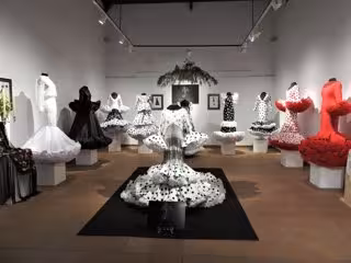 La muestra hace un recorrido por las creaciones de ese joven diseñador alcalareño y cuenta con una buena parte de los icónicos vestidos con los que ganó en 2020 el primer premio de la pasarela 'We Love Flamenco'. Una muestra titulada 'Rafaela', el nombre de la abuela de Javier a quien dedicó su colección ganadora y a quien ahora dedica esta magnífica exposición.