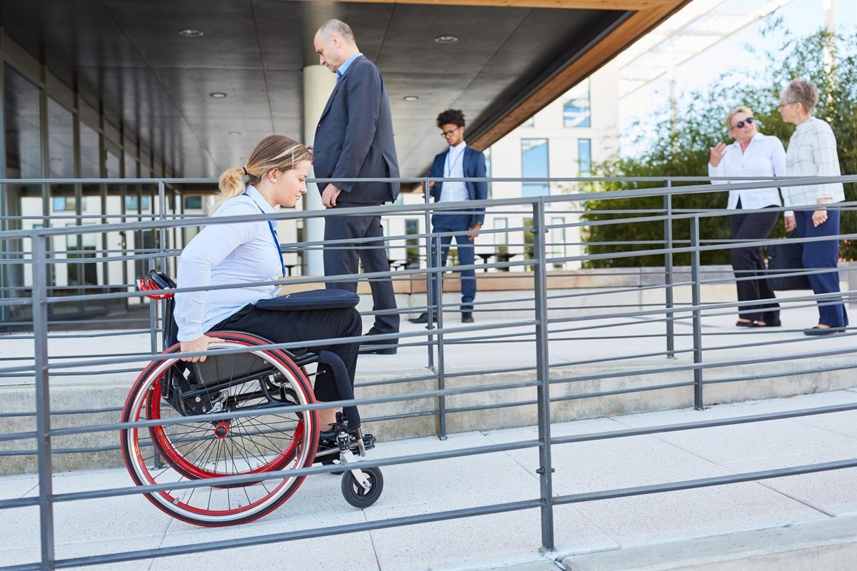 Archivo - Una mujer en silla de ruedas accede por una rampa a un edificio municipal en foto de archivo. - FUNDACIÓN ONCE - Archivo