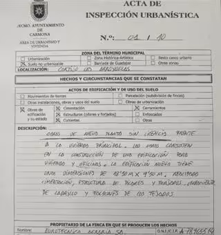 "Las obras consisten en la construcción de una edificación para viviendas y oficinas. La edificación nueva tiene unas dimensiones de 18,5 metros por 9,5 metros. Realizada la cimentación, estructura de pilares y forjados, cerramiento de ladrillo y faldones de los tejados", detalla el acta de inspección. Actualmente, el Ayuntamiento de Carmona está a la espera de que un informe jurídico dilucide si las obras en cuestión, merced a la legislación vigente en materia de ordenación del territorio, son legalizables o no, dado que tal circunstancia resolverá el tipo de procedimiento administrativo a emprender a cuenta de estas obras "sin licencia".