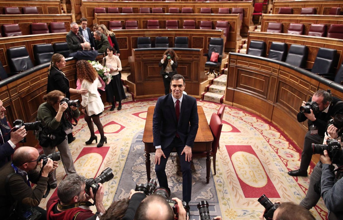 El presidente del Gobierno, Pedro Sánchez, posa sonriente en el hemiciclo del Congreso de los Diputados, tras obtener una votación favorable a su investidura - Eduardo Parra - Europa Press