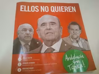 En la portada de dichas octavillas aparece la leyenda 'Ellos no quieren' sobre la imagen del presidente del Gobierno, Mariano Rajoy, del presidente de Banco Santander, Emilio Botín, y del vicepresidente de la Comisión Europea, Joaquín Almunia.