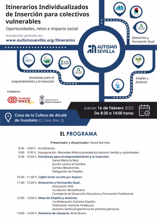 Autismo Sevilla organiza este jueves 16 de febrero una jornada en Alcalá de Guadaíra (Sevilla) bajo el título 'Itinerarios Individualizados de Inserción para colectivos vulnerables', en la que pretende analizar la situación actual de las personas con discapacidad a la hora de acceder al mercado laboral.