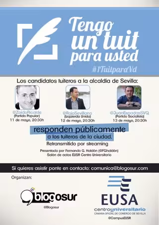 Grupo Blogosur Comunicación y EUSA Centro Universitario organizan el ciclo de jornadas 'Tengo un tuit para usted' en el que los tres candidatos a la Alcaldía de Sevilla de las formaciones con representación en el Ayuntamiento --Juan Ignacio Zoido (PP), Juan Espadas (PSOE) y Daniel González Rojas (IU)-- responderán públicamente a las preguntas que la ciudadanía plantee vía Twitter a través del 'hashtag' o etiqueta '#1TuitparaVd'.