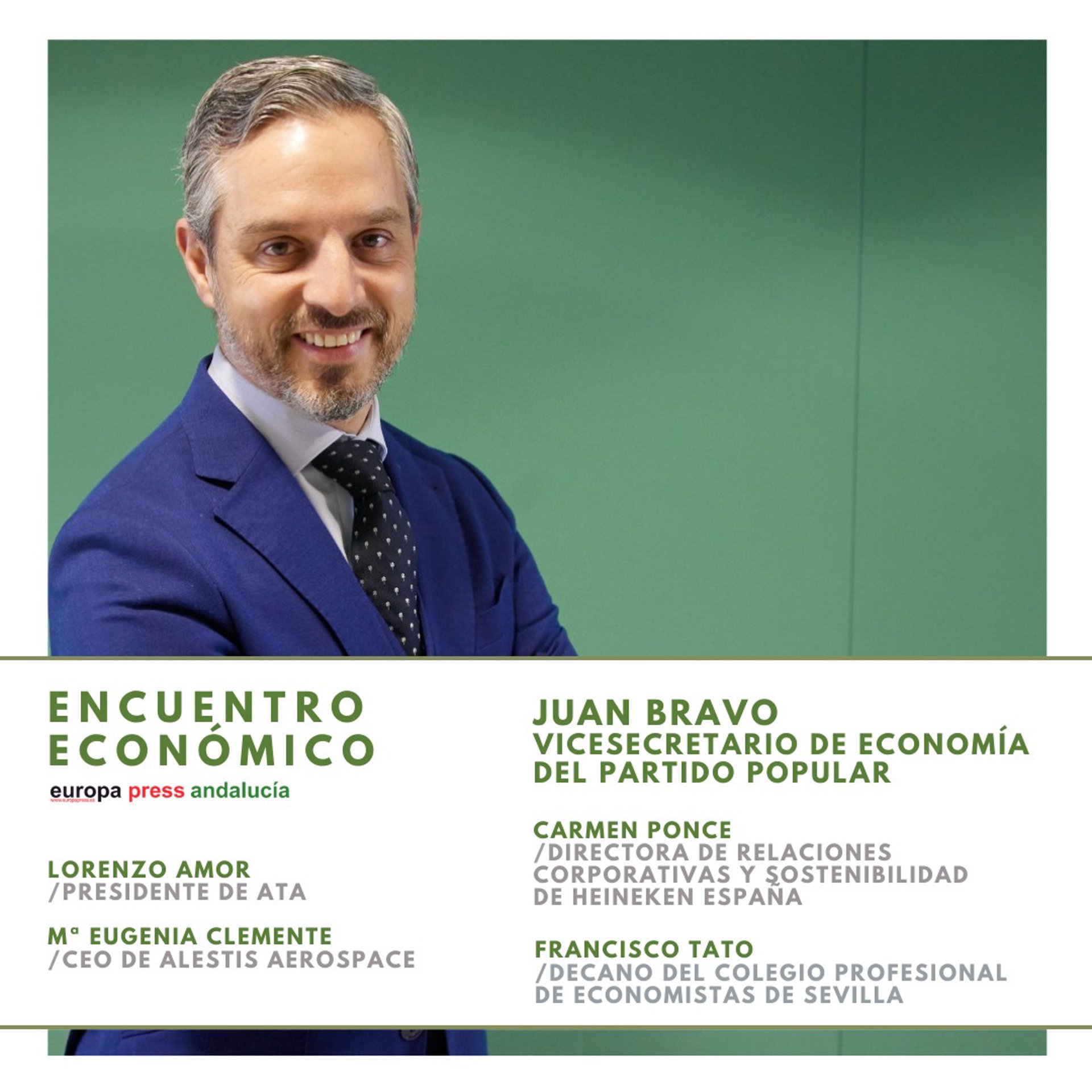 Junto a Bravo participarán en el encuentro económico el presidente de la Asociación de Trabajadores Autónomos (ATA) y vicepresidente de CEOE, Lorenzo Amor; la CEO de Alestis Aerospace, María Eugenia Clemente; la directora de Relaciones Corporativas y Sostenibilidad de Heineken España, Carmen Ponce; y el decano del Colegio Profesional de Economistas de Sevilla, Francisco Tato.