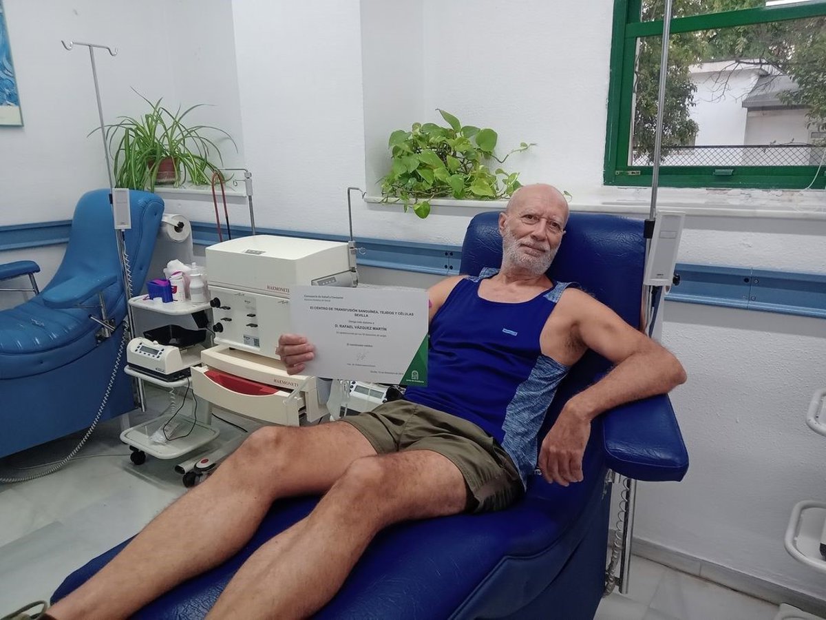 Rafael Vázquez Martín, a sus 64 años, está a punto de 'jubilarse' como donante de sangre en Sevilla, tras 67 donaciones realizadas en los últimos 22 años. Empezó "bastante tarde", allá por 2001, y a pesar de los problemas que tuvo en su momento con las agujas, "y lo mal que lo sigue pasando", le echó "valor", hasta el punto que "solía desfallecer cuando tenía que hacerme analíticas".