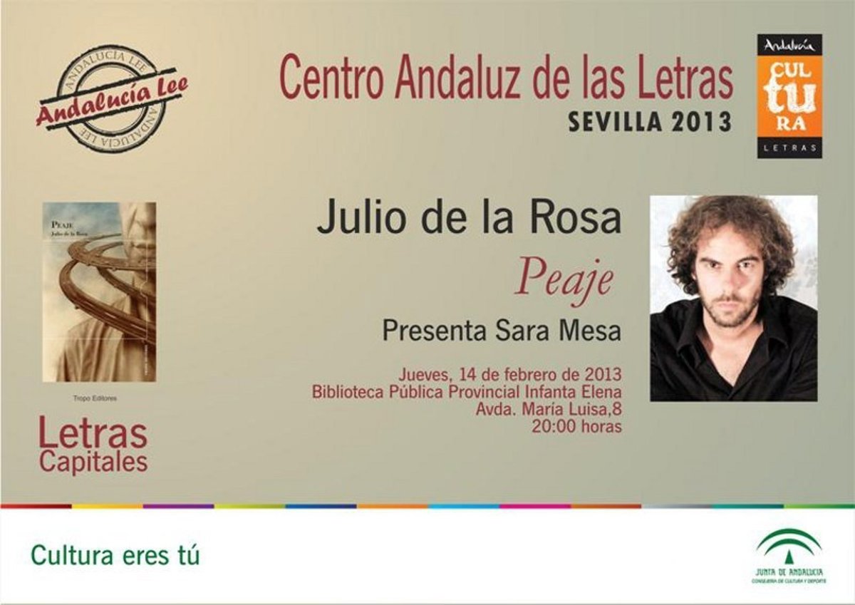El Centro Andaluz de las Letras (CAL) continúa el programa de actividades 'Letras Capitales' en Sevilla este jueves 14 de febrero con la presentación de la primera novela del escritor y músico Julio de la Rosa, 'Peaje', publicada por Tropo Editores. El encuentro será en la Biblioteca Pública Provincial Infanta Elena a las 20,00 horas, y estará conducido por la escritora Sara Mesa.