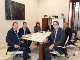 El consejero de Justicia e Interior, Emilio de Llera, y representantes del Consejo Andaluz de Colegios de Abogados han acordado este miércoles un nuevo calendario de pagos para la asistencia jurídica gratuita con el objetivo de avanzar en el abono de este servicio fundamental para la ciudadanía y garantizar así su prestación en la difícil coyuntura económica y presupuestaria actual.