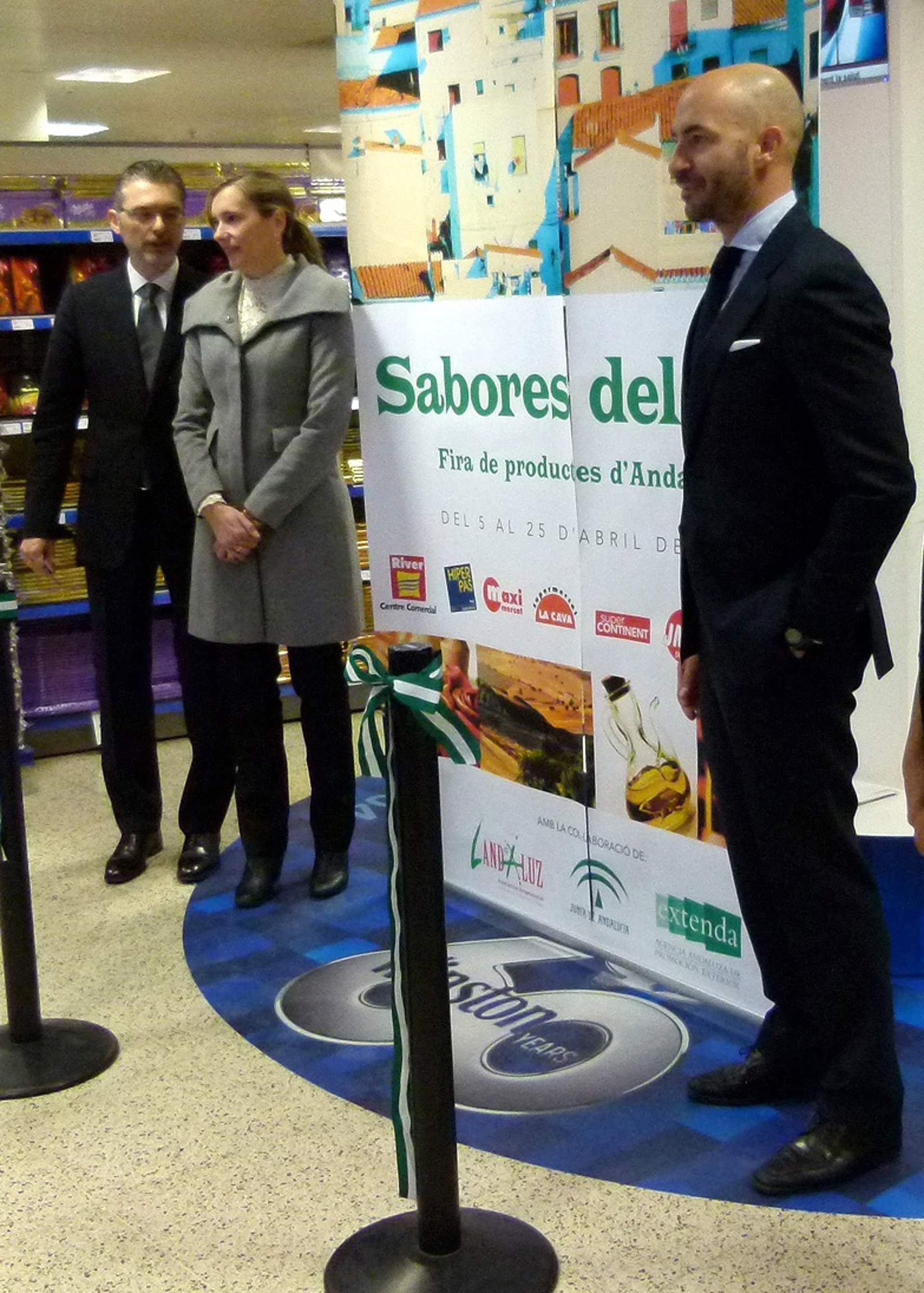 La consejera delegada de Extenda, Vanessa Bernad, el presidente de la asociación Lándaluz, Alvaro Guillén, y el director Comercial de Mercacénter, Juan Vicente Sánchez, fueron los encargados de inaugurar esta acción promocional en la sede del hipermercado River de Mercacenter, en Sant Juliá de Loria.