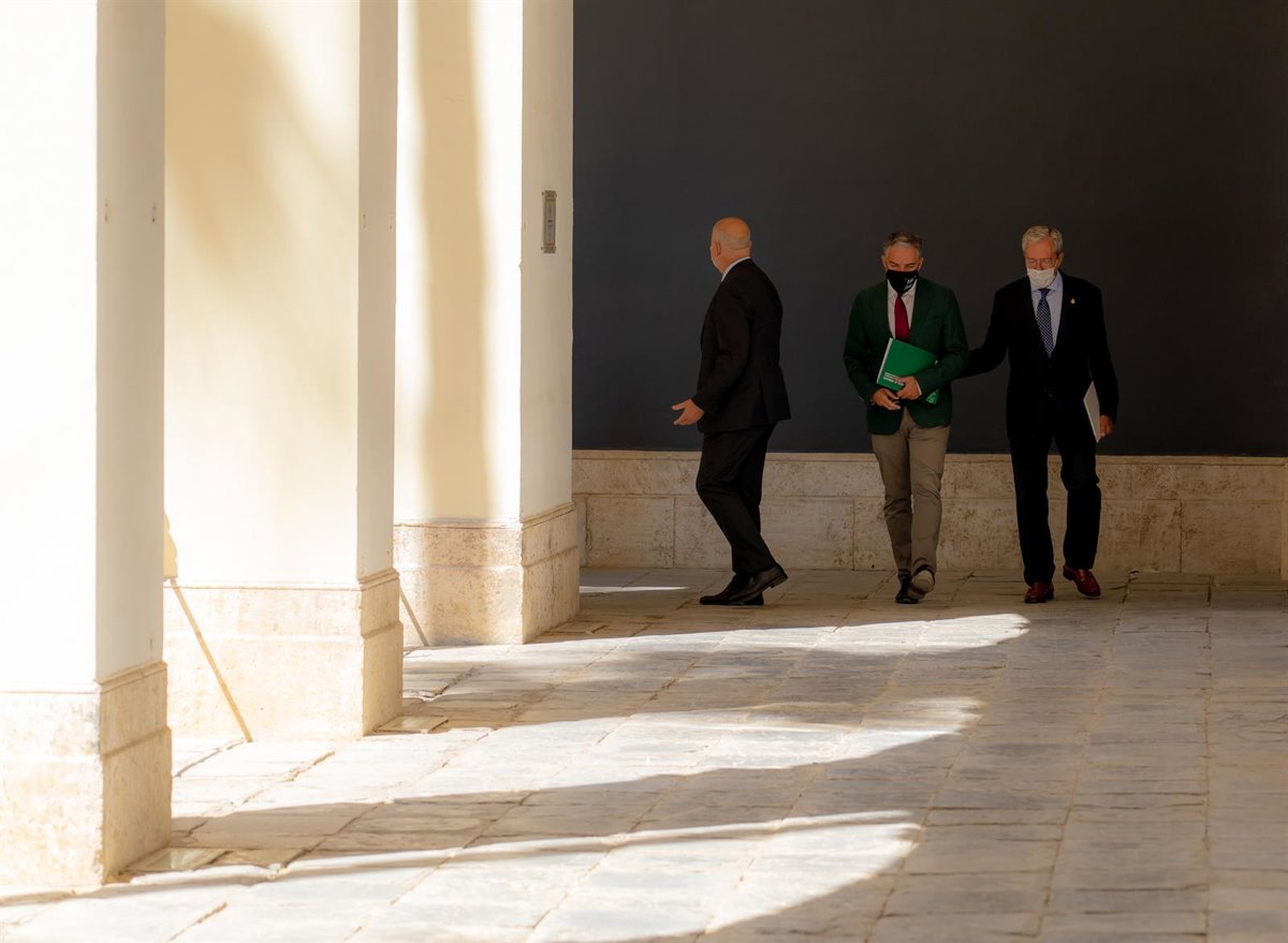Eel consejero de la Presidencia, Administración Pública e Interior y portavoz del Gobierno, Elías Bendodo (c), el consejero de Educación y Deporte, Javier Imbroda (1i), y el consejero de Transformación Económica, Industria, Conocimiento y Universidades, - Eduardo Briones - Europa Press