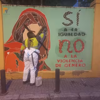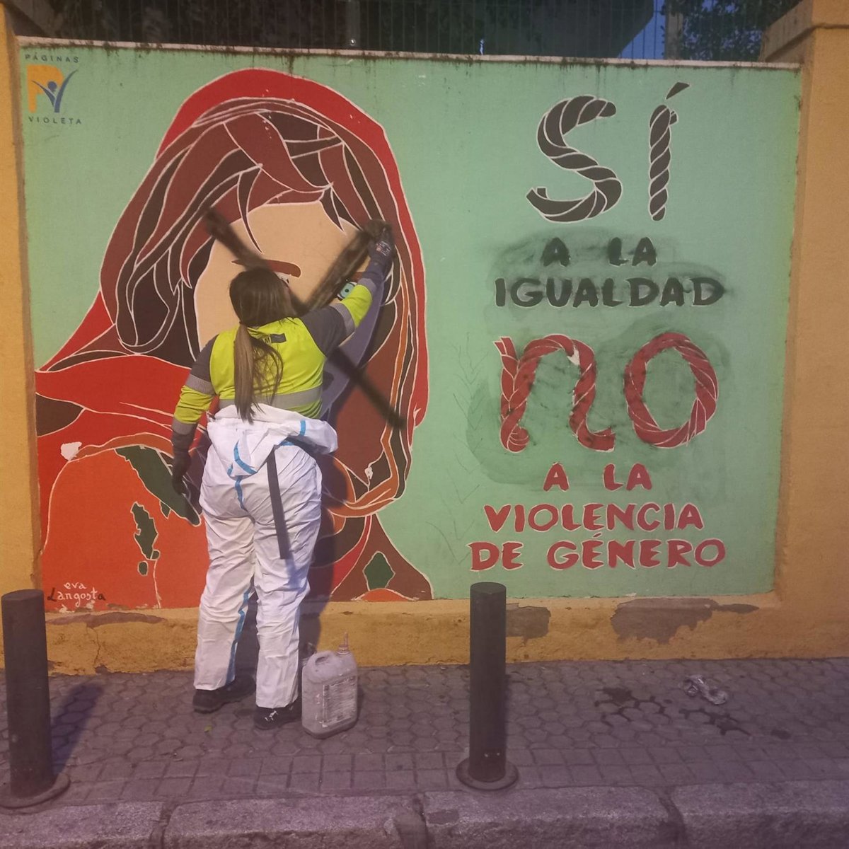 Operarios de Lipasam han procedido a reparar el mural por la igualdad y contra la violencia de género del Colegio de Infantil y Primaria (CEIP) Huerta de Santa Marina, en el entorno de la calle San Luis, que amaneció este pasado lunes 13 de febrero con pintadas. La brigada antigraffiti creada por la empresa municipal para intervenir en las fachadas del Casco Antiguo retiró la pintada a las pocas horas de que la Asociación de Madres y Padres (AMPA) del Huerta de Santa Marina diera el aviso en el Distrito.