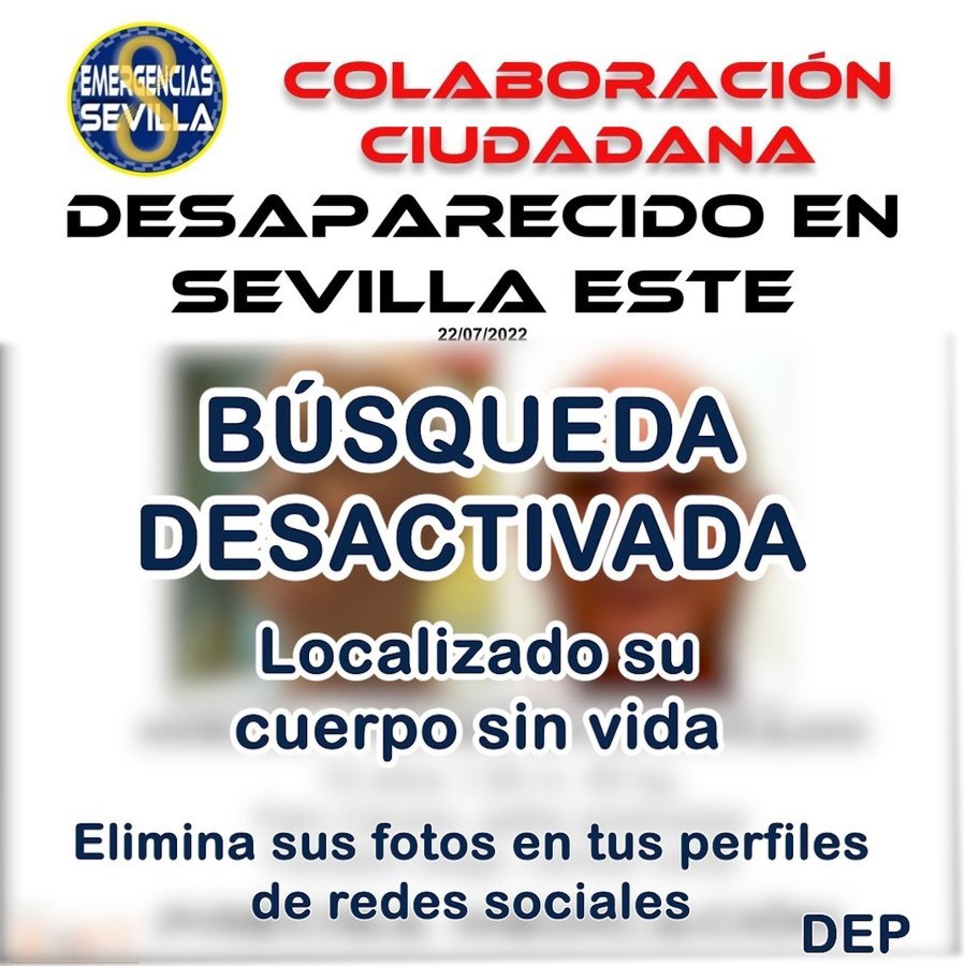 Emergencias Sevilla ha desactivado este sábado la búsqueda del hombre de 70 años desaparecido en Sevilla desde el viernes tras localizar su cuerpo sin vida.
