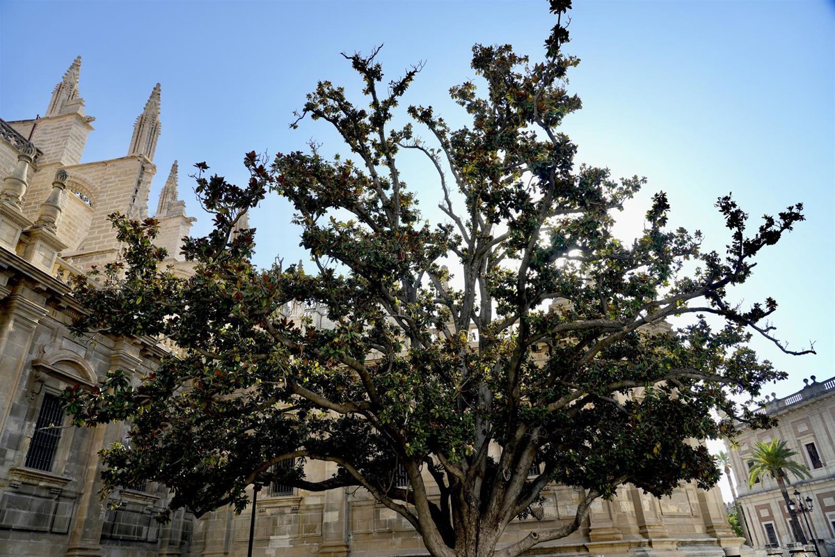 El magnolio junto a la Catedral de Sevilla presenta "un buen estado fisiológico" y "se aprecian" en él "brotes verdes" después de que se le aplicara por parte de los servicios técnicos del Ayuntamiento hispalense un tratamiento específico tras sufrir "un golpe de calor" el pasado mes de mayo de este año.