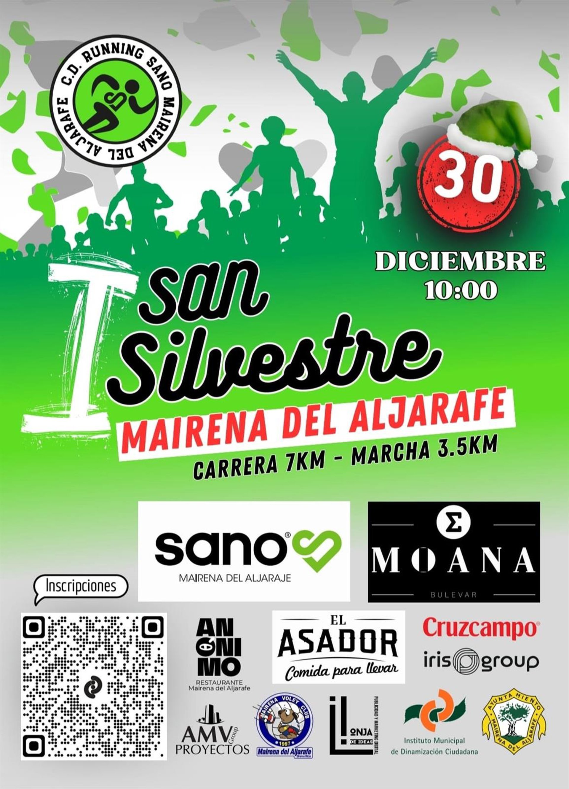 El próximo 30 de diciembre a las 10,00 horas, la localidad de Mairena del Aljarafe (Sevilla) se convertirá en el escenario de la I San Silvestre, una iniciativa impulsada por el C.D. Running Sano de Mairena del Aljarafe que cuenta con patrocinadores como el restaurante mairenero Anónimo, AMV Group Proyectos, El Asador, Mairena Voley Club, Mona Bulevar, Cruzcampo, Iris Group, el Instituto Municipal de Dinamización Ciudadana, el Ayuntamiento de Mairena del Aljarafe y La Lonja de Ideas.