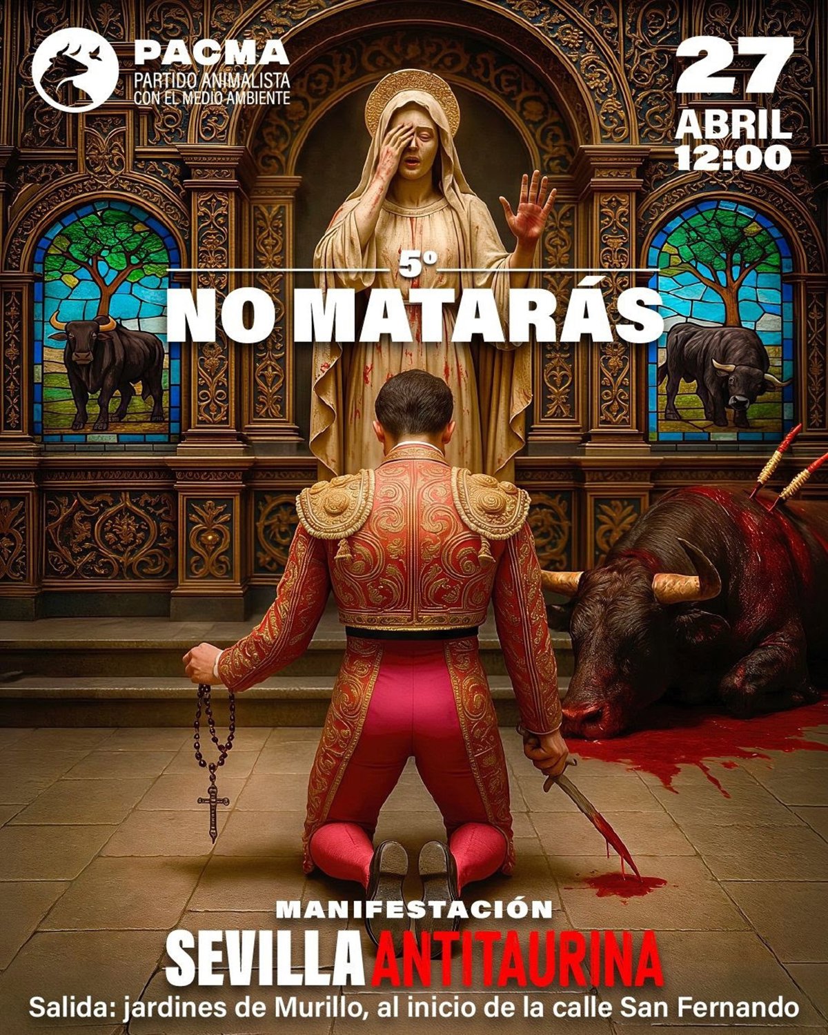 El Partido Animalista (Pacma) ha convocado, un año más, su manifestación "Sevilla Antitaurina", que se celebrará desde las 12,00 horas de este domingo con salida desde los Jardines de Murillo para "alzar la voz contra la tauromaquia" y exigir la abolición de una práctica que, a juicio de la formación, "es incompatible con una sociedad ética, justa y moderna".