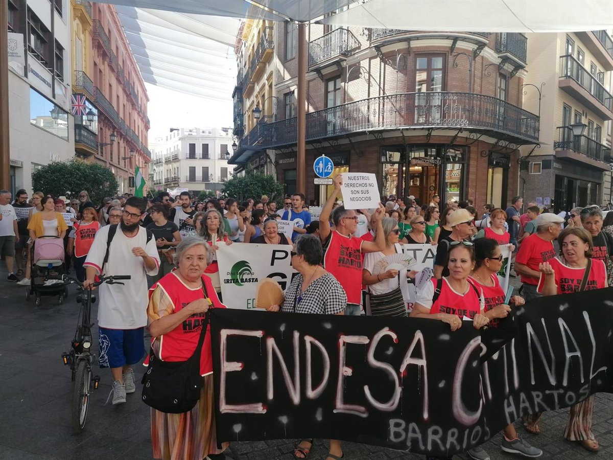 Más de 1.500 personas se han manifestado este sábado por las calles del centro de Sevilla para protestar contra los cortes de luz y la anunciada subida del agua, según estimaciones de la plataforma interdistritos Barrios Hartos, entidad que había convocado esta marcha bajo el lema 'Nos cortan la luz, nos suben el agua' para insistir en la defensa de los servicios públicos básicos.