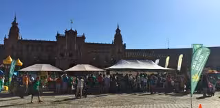 La 'fan zone' de la Caja Rural del Sur-Seguros RGA este sábado, instalada en una carpa en la Plaza de España desde las 09,00 horas hasta las 14,00 horas, "no ha dejado de recibir la visita de sevillanos solidarios, además de empleados y directivos de Caja Rural del Sur que también han querido sumarse a la participación en esta iniciativa solidaria".