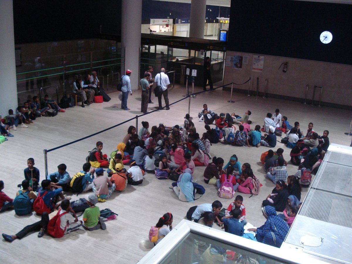 Estos menores, recién llegados de los campamentos de refugiados de Tinduf, pasarán los próximos dos meses en la provincia de Sevilla, lejos de su difícil realidad cotidiana, gracias al trabajo de un gran equipo de profesionales y voluntarios de la Asociación Provincial de Sevilla de Amistad con el Pueblo Saharaui, que se ha desplazado hasta el aeropuerto San Pablo para recogerlos y llevarlos a los Centros Sociales Miraflores, cedidos por la Diputación de Sevilla, donde se ha encontrado con sus familias de acogida.