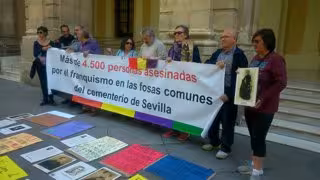 Los colectivos de recuperación de la memoria histórica de Sevilla han celebrado este jueves una concentración a las puerta del Ayuntamiento hispalense, para manifestar su repulsa a la posibilidad de que el ministro de Justicia, Rafael Catalá, asistiese al acto celebrado por la institución para formalizar la declaración de "reparación y reconocimiento personal" concedida por tal ministerio respecto a 479 funcionarios y empleados municipales sancionados y "depurados" por motivos políticos después del alzamiento militar de 1936.