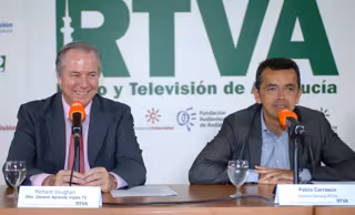 El director general de Radio Televisión de Andalucía (RTVA), Pablo Carrasco, y el profesor Richard Vaughan han presentado este martes en Sevilla el programa 'Aprende Inglés', que se acaba de incorporar a la parrilla de Canal Sur 2, tanto en horario de mañana como de tarde y para estudiantes de distintos niveles.