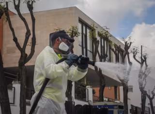 Personal del ayuntamiento desinfeccta la calle del centro de personas mayores Joaquín Rosillo de San Juan de Aznalfarache - María José López - Europa Press