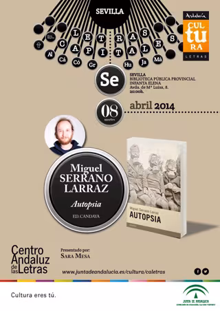 La Consejería de Educación, Cultura y Deporte, a través del Centro Andaluz de las Letras (CAL), prosigue el programa de actividades 'Letras Capitales' en Sevilla este martes 8 de abril, con la presentación de la nueva novela de Miguel Serrano Larraz, 'Autopsia', publicada por la editorial Candaya. El encuentro será en la Biblioteca Pública Provincial Infanta Elena a las 20,00 horas, y contará con la intervención de la escritora Sara Mesa.