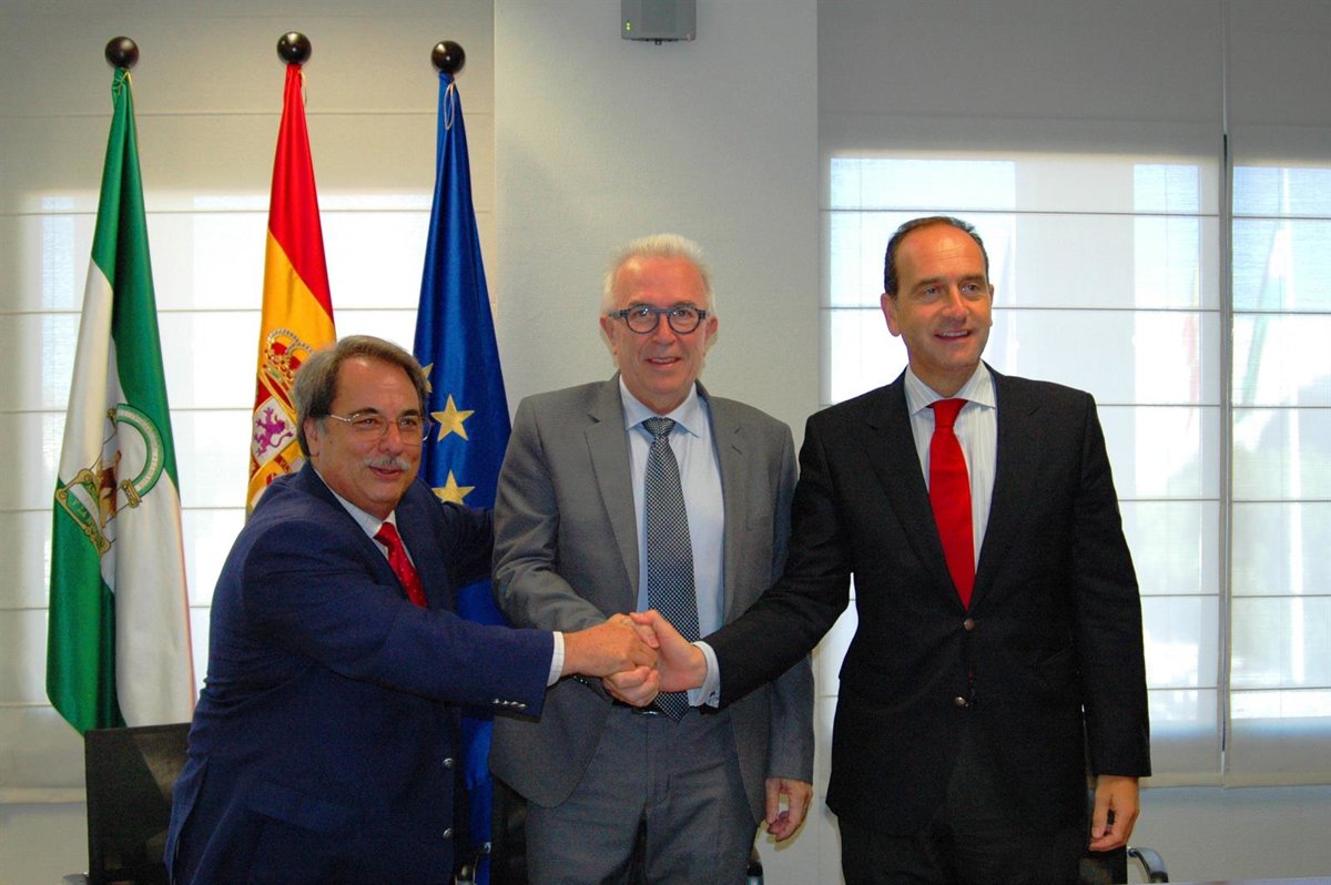 El consejero de Empleo, Empresa y Comercio, José Sánchez Maldonado, ha presidido este jueves la firma de un convenio de colaboración con el delegado territorial del Banco Santander, Alberto Delgado, y el rector de la Universidad Internacional de Andalucía, Eugenio Domínguez Vílches, que permitirá formalizar la contratación de 1.000 jóvenes andaluces seleccionados para iniciar prácticas profesionales no laborales a partir del mes de septiembre.