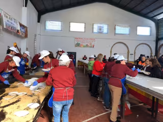 Desde temprano, la Caseta Municipal de Lora del Río ha sido "un ir y venir" de los más de 120 voluntarios, con todos los productos necesarios para cocinar los 1.600 kilos de migas, según explican desde el Ayuntamiento.
