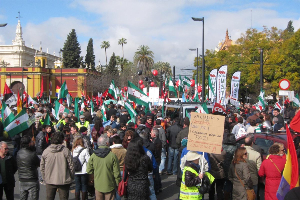Alrededor de 8.000 personas, según los organizadores, y de 3.000, según las estimaciones de la Policía Nacional difundidas por la Delegación del Gobierno, convocadas por medio centenar de colectivos integrados en el denominado 'Bloque Crítico', han protagonizado este jueves en Sevilla una manifestación alternativa a la que con motivo del 28 de febrero, Día de Andalucía, había organizado la plataforma 'Compromiso Social y Progreso', para defender "la dignidad y la vida de los perjudicados por las políticas de recortes".