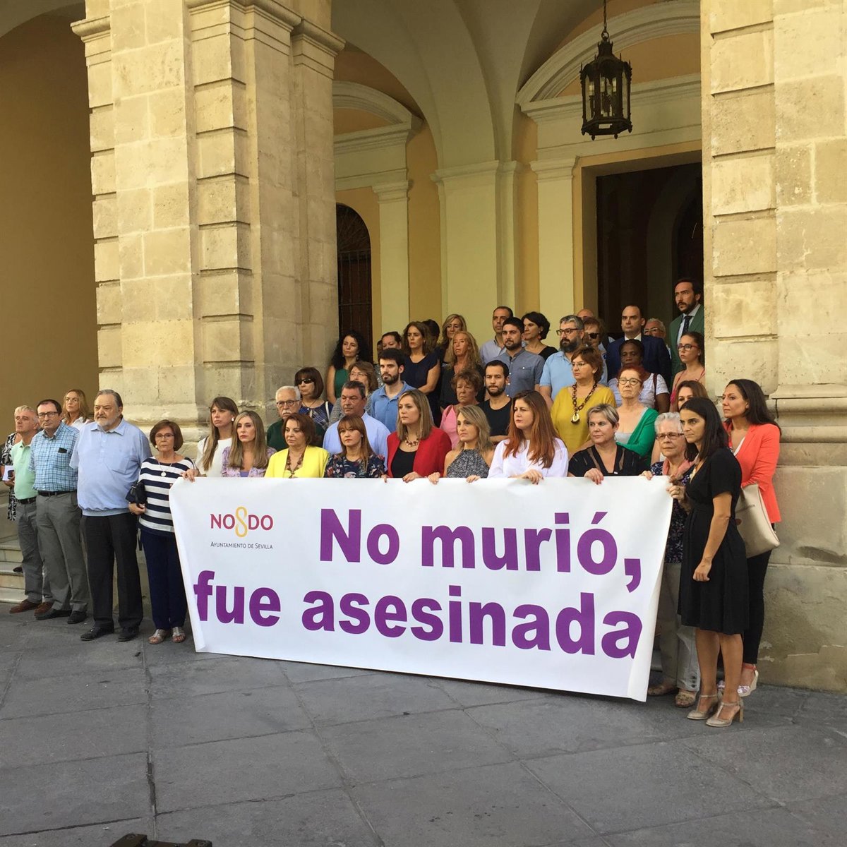 Las escalinatas del Ayuntamiento de Sevilla han sido este lunes el escenario de una concentración con un minuto de silencio, en repulsa al crimen perpetrado en de Úbeda (Jaén), donde un varón natural de Osuna ha matado a su pareja, vecina de Arahal, en lo que constituye un nuevo crimen de violencia de género.