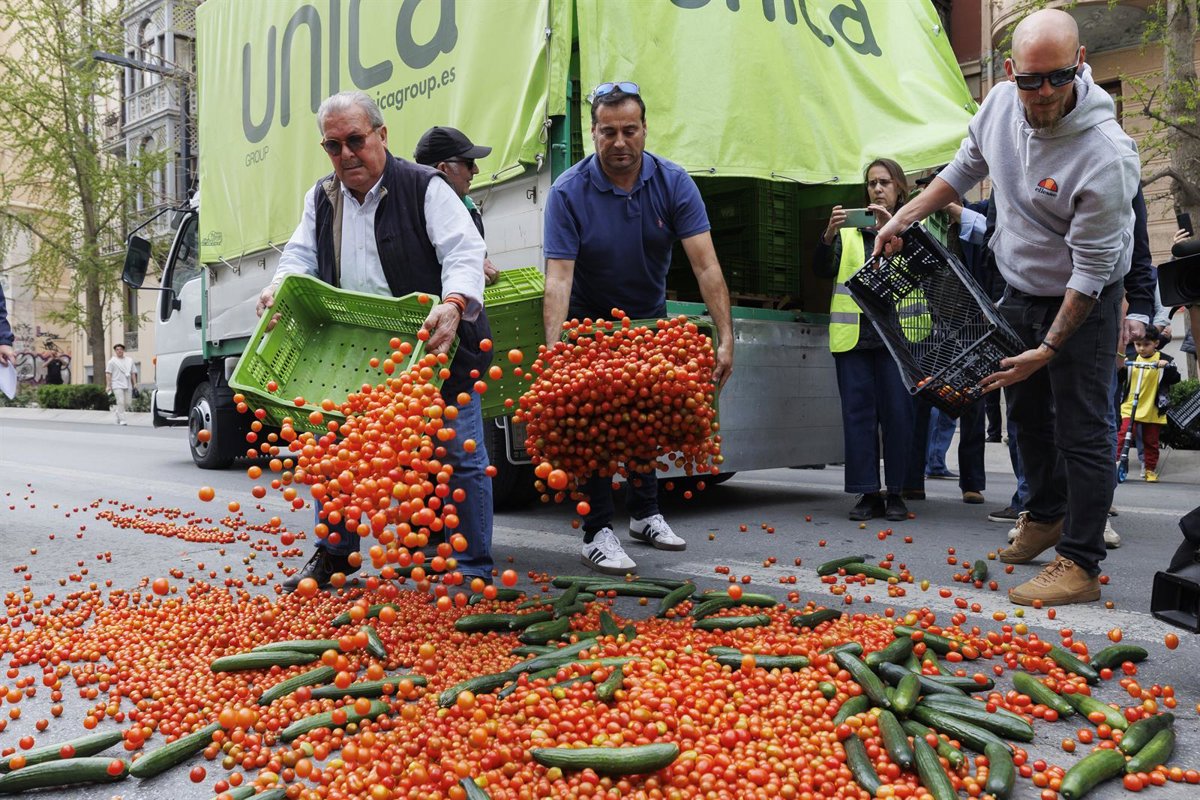 Archivo - Agricultores tiran tomates durante una tractorada en demanda de medidas para la viabilidad de las explotaciones agrarias y ganaderas, en foto de archivo. - Álex Cámara - Europa Press - Archivo