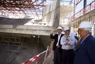 Sánchez Monteseirín visitó hoy las obras de ampliación del palacio de exposiciones y congresos, gestionado por Feria Iberoamericana de Sevilla (Fibes), acompañado del delegado de Urbanismo, Manuel Rey, y los miembros de la Comisión Ejecutiva del Plan Estratégico 'Sevilla 2020'. Todos ellos, así, pudieron comprobar el avance de estas obras adjudicadas a Acciona, Inabensa y Heliopol por más de 66,1 millones de euros y cuya primera piedra colocó el propio alcalde el pasado 14 de enero de 2008. "Van a muy buen ritmo", destacó el primer edil, quien manifestó que los trabajos finalizarán a final de año, en diciembre.