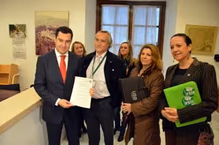 El presidente del PP-A, Juanma Moreno, ha registrado este miércoles en el Parlamento andaluz, junto a representantes de los sindicatos de la educación concertada, una proposición no de Ley para exigir la equiparación salarial de los 18.000 docentes de este sector "discriminados" por la Junta.