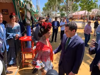 Este breve encuentro se ha producido en la puerta de una caseta privada en la que se encontraba Olona, que ha salido al exterior a saludar a Moreno, quien iba paseando por el real mientras recibía el saludo de varios ciudadanos, que también le pedían fotografiarse.