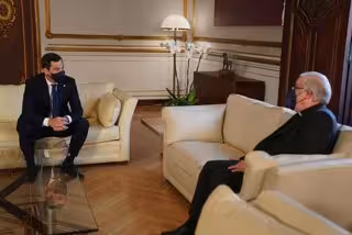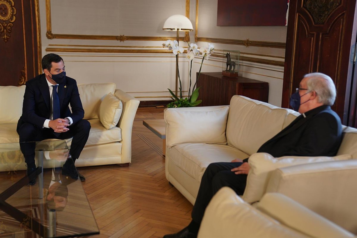 El presidente de la Junta de Andalucía, Juanma Moreno, ha recibido este martes en San Telmo, sede del Gobierno autonómico, al arzobispo de la Diócesis de Sevilla, monseñor José Ángel Saiz Meneses, dentro de la ronda de contactos que está llevando a cabo el prelado hispalense desde su toma de posesión, que se oficializó este sábado en la Catedral.