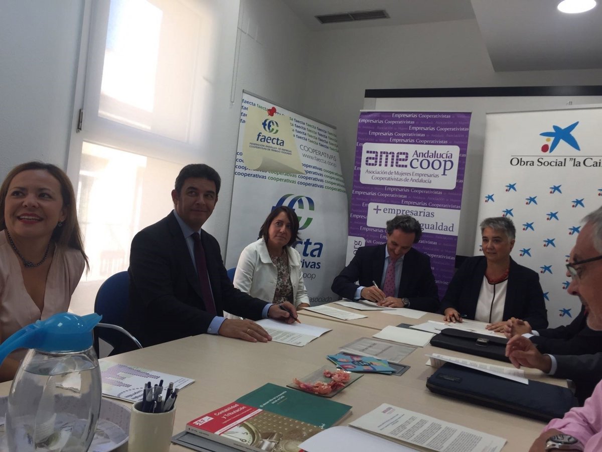 La asociación de mujeres cooperativistas Amecoop-Andalucía y la Obra Social de La Caixa han firmado un nuevo convenio de colaboración para la puesta en marcha de la cuarta edición del proyecto 'Construyendo tu oportunidad: autoempleo cooperativo femenino y autonomía económica', de forma que ambas organizaciones trabajaran para mejorar el empleo de las mujeres de la provincia de Sevilla.