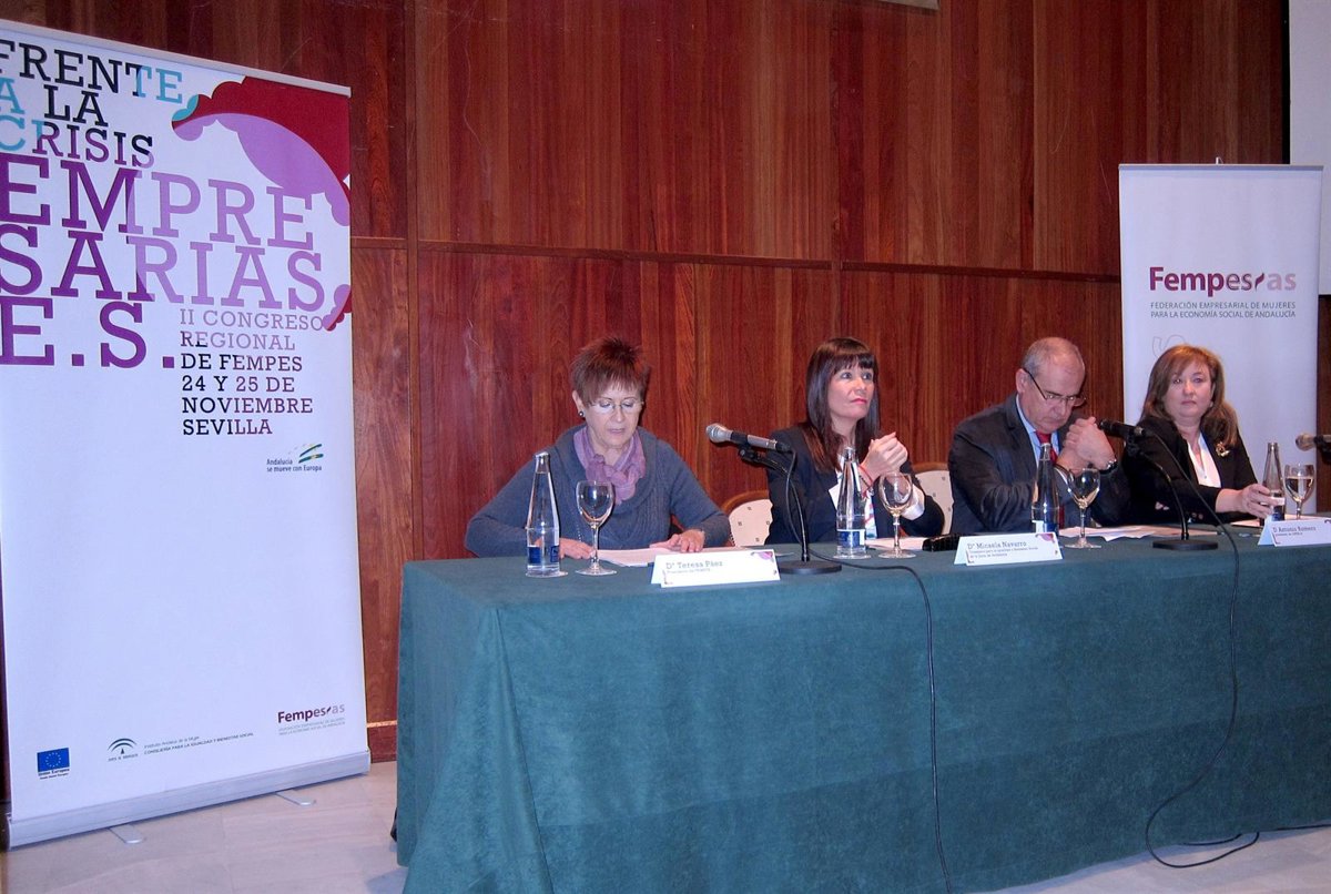 La titular de Igualdad y Bienestar Social ha inaugurado este jueves el II Congreso Regional de la Federación Empresarial de Mujeres para la Economía Social de Andalucía (Fempes) en Sevilla, en el que ha estado acompañada de la presidenta de Fempes, Teresa Páez, el presidente de la Confederación Empresas para la Economía Social de Andalucía (Cepes-A), Antonio Romero, y la directora del Instituto Andaluz de la Mujer (IAM), Soledad Pérez.