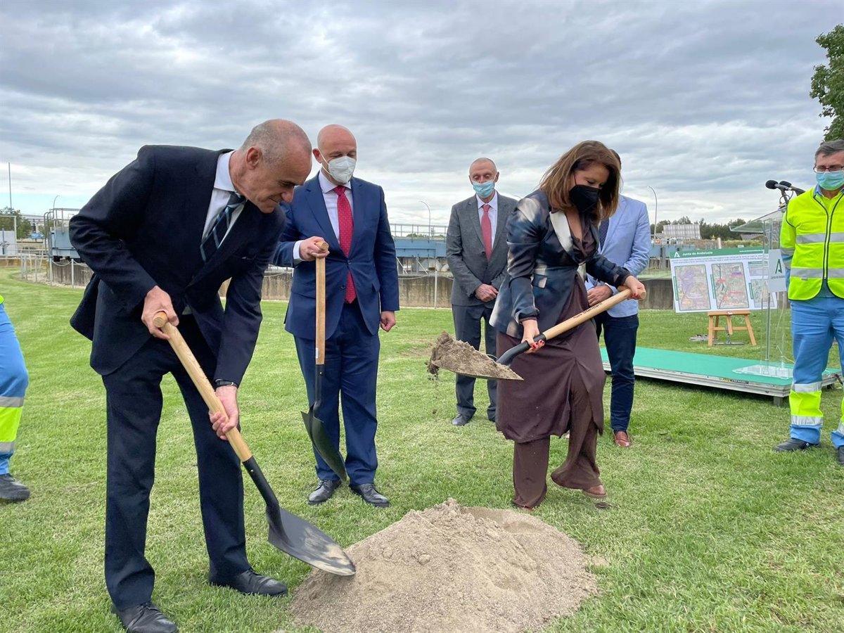 Muñoz, junto a la consejera de Agricultura, Ganadería, Pesca y Desarrollo Sostenible, Carmen Crespo; el alcalde de Dos Hermanas, Francisco Rodríguez; el delegado del Gobierno de la Junta de Andalucía en Sevilla, Ricardo Sánchez, y el consejero delegado de Emasesa, Jaime Palop, ha asistido a la colocación de la primera piedra de las obras de ampliación de esta EDAR, en Dos Hermanas.
