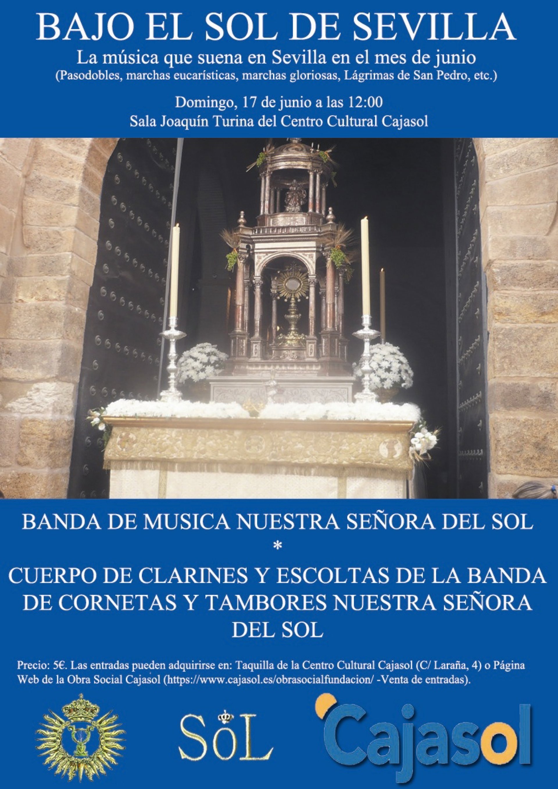 La Banda de Música 'Nuestra Señora del Sol' y el Cuerpo de Clarines y Escoltas de la Banda de Cornetas y Tambores 'Nuestra Señora del Sol' se unen este domingo para ofrecer un concierto conjunto en la Sala Joaquín Turina del Centro Cultural Cajasol de Sevilla, en el que rendirán homenaje a la Virgen de la Hiniesta Gloriosa con una serie de marchas eucarísticas, así como interpretarán toques militares como los que se escucharán desde la Giralda en la noche del 28 al 29 de junio con motivo de la festividad de San Pablo.