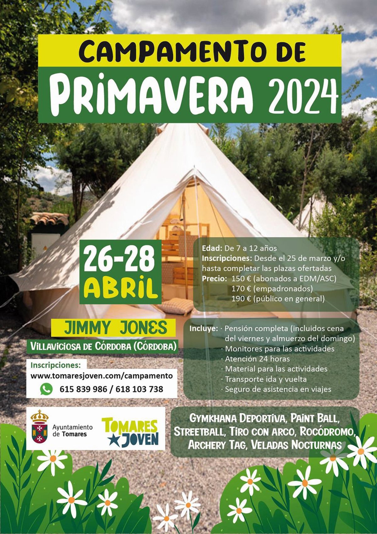 Del 26 al 28 de abril, medio centenar de niños de Tomares, de entre siete y doce años, podrán "pasarlo en grande" en el Campamento 'Jimmy Jones', en Villaviciosa de Córdoba. Un Parque Multiaventura al más puro estilo americano, donde acamparán en llamativas tiendas tipi y participarán en divertidas actividades: Gymkhana deportiva, Paint ball, Streetball, Tiro con Arco, rocódromo, archery tag y veladas nocturnas, según ha detallado el Consistorio en una nota de prensa.