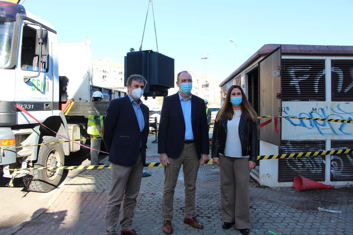 La delegada del Distrito Sur del Ayuntamiento de Sevilla, María Luisa Gómez; el Comisionado para el Polígono Sur, Jaime Bretón, y el director general de Endesa en Andalucía y Extremadura, Rafael Sánchez, han asistido este viernes a la instalación de un nuevo transformador en el Polígono Sur que permitirá duplicar la potencia en la zona de Murillo y La Oliva, donde solo el 22 por ciento de la energía distribuida la consumen clientes con contrato en vigor.